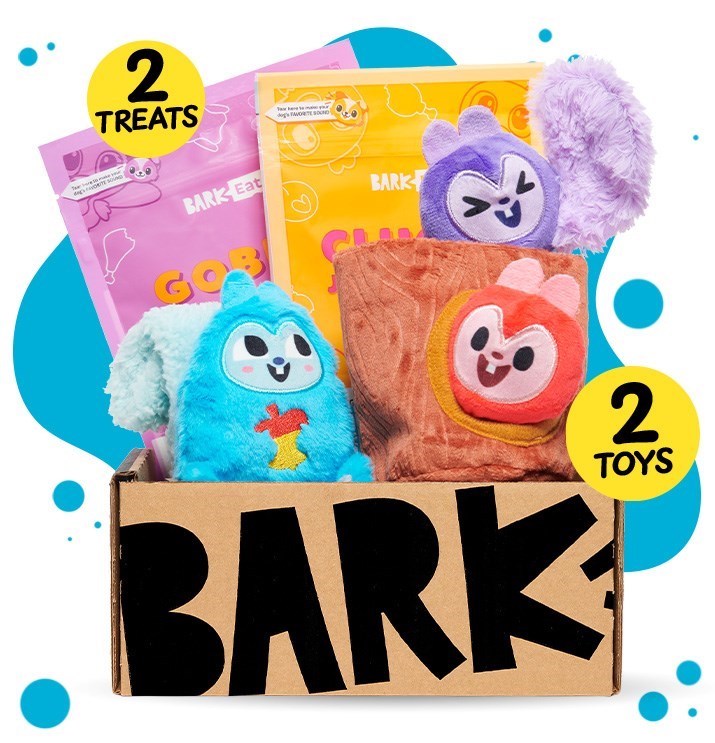 Gift Certificate for 1 month BarkBox. What's in a BarkBox? 2 BAGS OF HEALTHY TREATS 2 ORIGINAL PLUSH TOYS 1 Surprise Item For snuggling, squeaking, and playing together. Delicious and customizable for picky eaters.