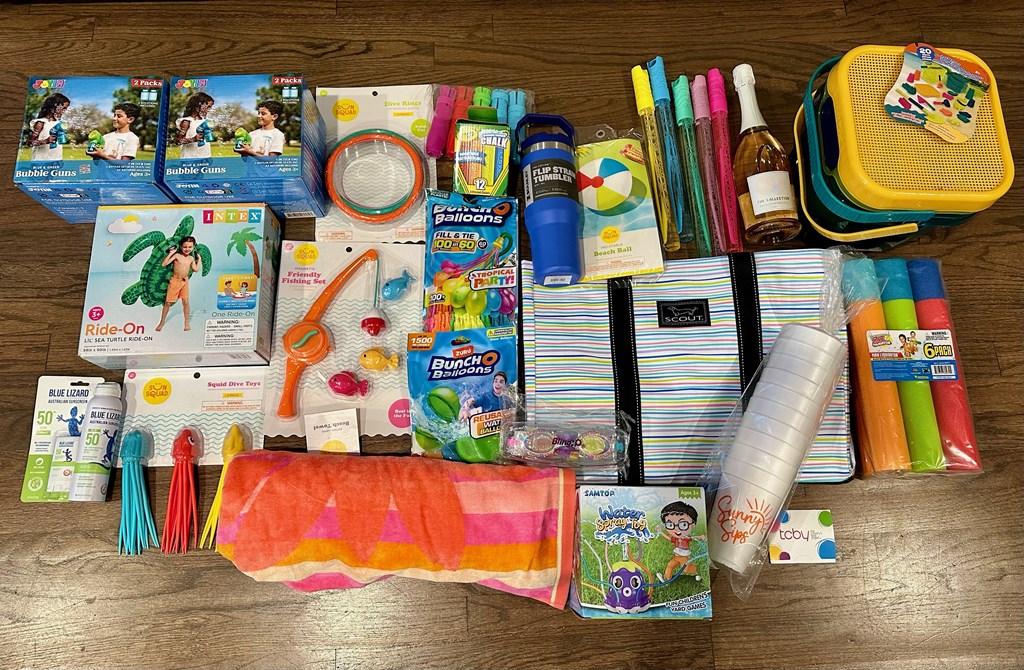 Value: $360 Large Scout Tote Bag $20 TCBY Gift Card 30 oz. Stanley Tumbler Bling20 Swim Goggles Extra Long Beach Towel Bottle of Rose ""Sunny Sips"" Styrofoam Cups 20 Piece Sand Toy Bucket Sidewalk Chalk with Chalk Holders Blue Lizard Face Sunscreen Stick & Spray Ride on Inflatable Sea Turtle Squid Diving Toys & Diving Rings 4 Bubble Guns Water Balloons Reusable Water Balloons Beach Ball Magnetic Fishing Set 6 Max Liquidator Water Blasters Sprinkler Spray Toy Bubble Wands