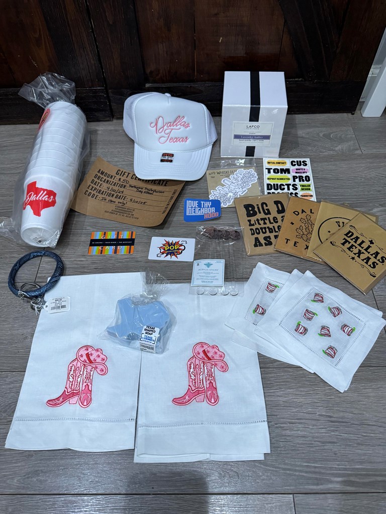 Value: $460 Madison cowboy tea towels, stir sticks, napkins, candle and basket $40 Pop Popcorn Gift Card & Dallas Cups $50 Neighborhood Supply Co. Gift Card & Dallas hat $50 Mi Cocina Gift Card White Rock Soap Gallery soap and cards O Ring
