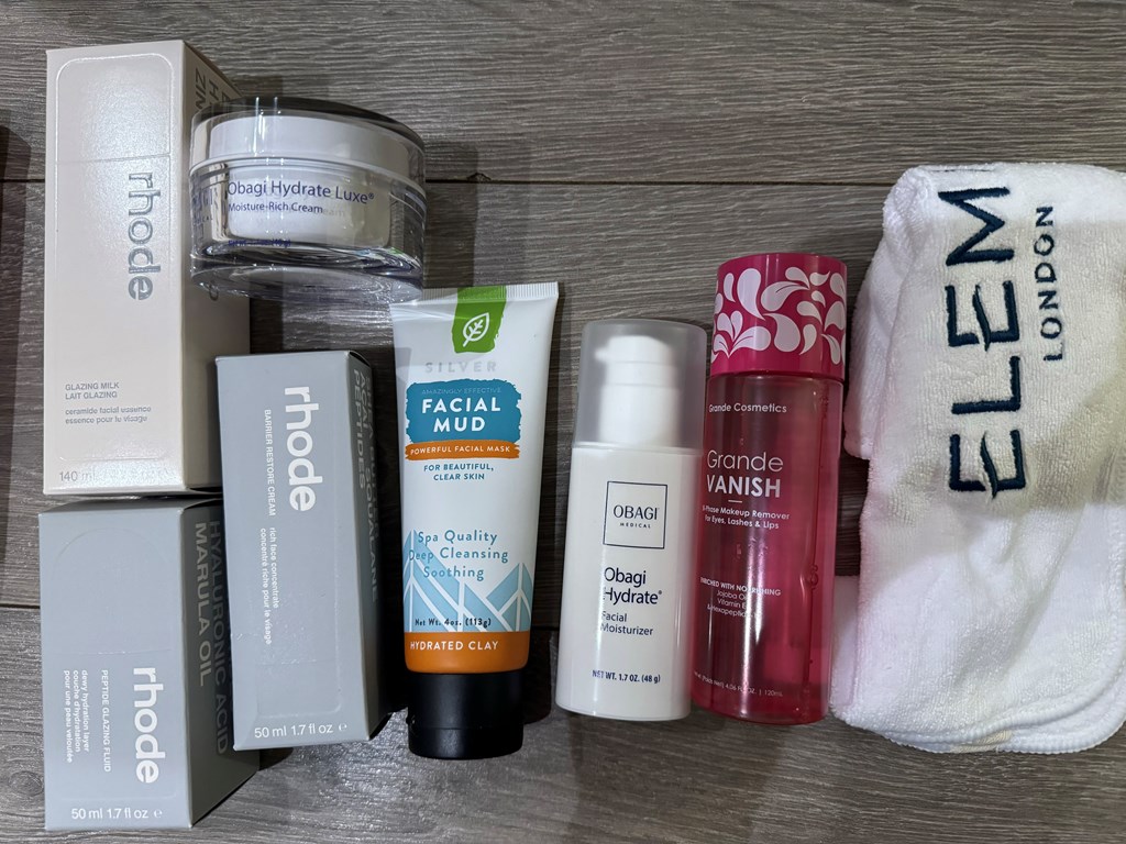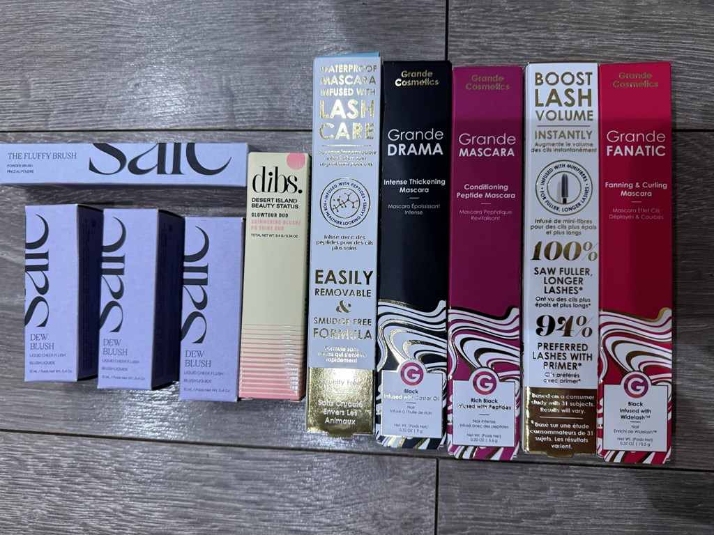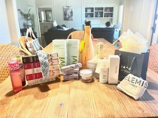 Value: $684 Vueve Champagne and chiller $60 Dry Bar Certificate Obagi Hydrate facial moisturizer Obagi Hydrate Luxe cream Divi Shampoo Divi conditioner Headband, scrunchie, towel Rhode glazing milk Rhode barrier restore cream Rhode peptide glazing fluid Saie Dew Blush x 3 Saie the fluffy brush Dibs Glowtour duo blush Grande Fanatic fanning and curling mascara 5 pack Grande Vanish remover Silver facial mud