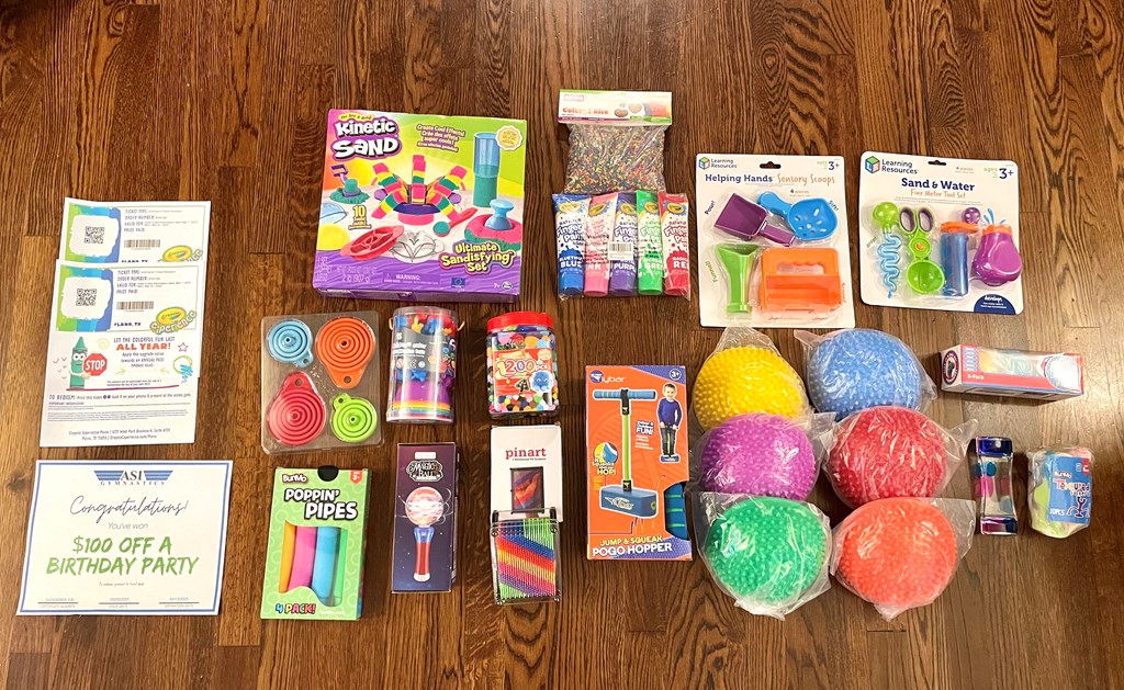 Value: $522 Strong Fitness (11 time punch card) $165 value 2 tickets to the Crayola Experience $100 off ASI party Balance Pods Kinetic Sand Kit Counting Animals Matching Color Sorting Toy Funnels Sand & Water Fine Motor Set Sensory Scoops Rainbow Rice Mini Stress Balls Pom Poms Bunmo Textured Suction Bath Toys Art Creativity Light Up Magic Ball Wand Poppin' Pipes Liquid Motion Bubble Timer Pin Art Toy Crayola Bathtub Finger Paint