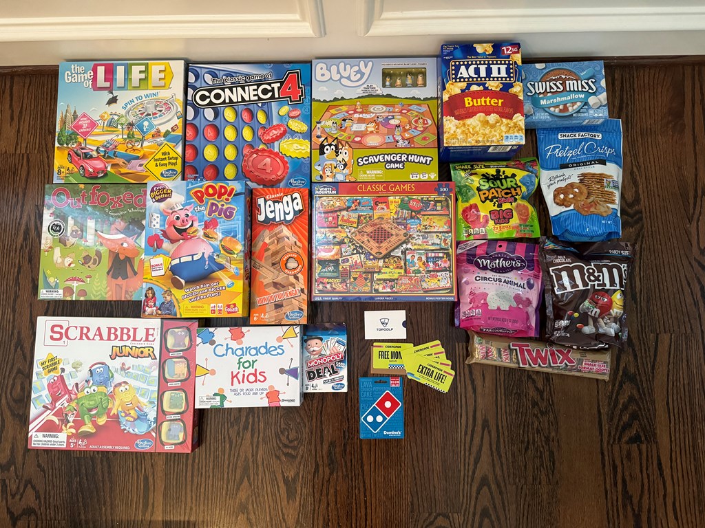 Value: $450 $25 CAMP Gift Card $50 Top Golf Gift Card $50 Dominos Pizza Gift Card $40 Cidercade Gift Card 4 Cidercade Free Play Cards (free admission to Cidercade with unlimited free play on all arcade games) The Game of Life Connect 4 Pop the Pig! Outfoxed Jenga Bluey Scavenger Hunt Game Scrabble, Jr. White Mountain 500 pcs. Classic Games Puzzle Charades for Kids Monopoly Deal Card Game 3 Sprouts Toy Box