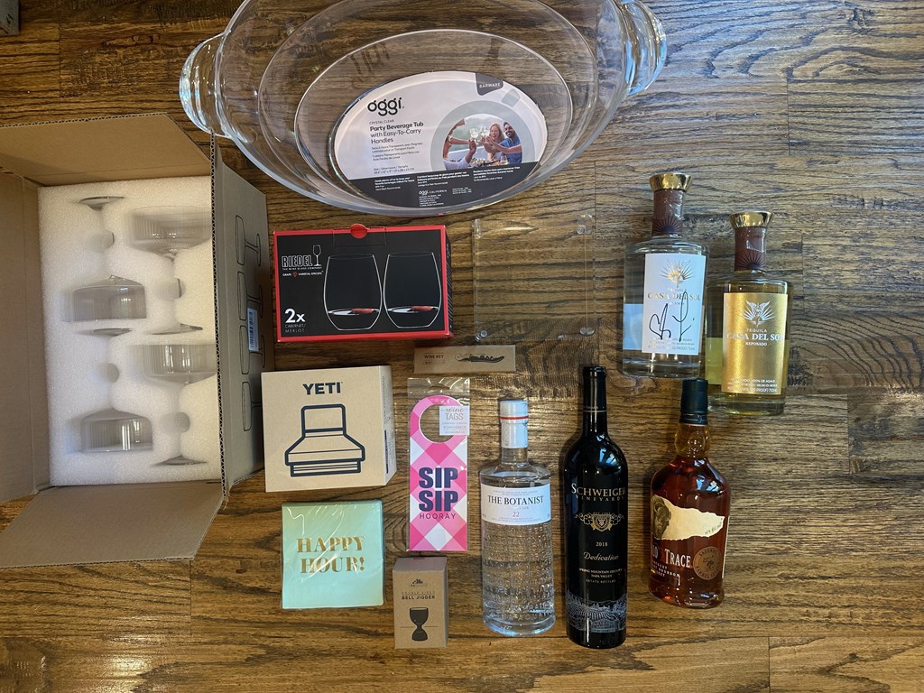 Value: $494 Buffalo Trace Single Barrel Store Pick 2018 Schweiger Dedication Tequila Reposado by Casa del Sol Blanco Tequila by Casa del Sol, signed by Eva Longoria (priceless) Botanist Gin Oggi Acrylic Beverage Tub Acrylic Napkin Holder Happy Hour Cocktail Napkins A Bar Above Bell Jigger A Bar Above Wine Key Yeti Rambler Cocktail Shaker Lid Rosanne Beck Wine Tags Riedel Stemless Wine Glass, qty 2 Ribbed Coupe Cocktail Glasses, qty 4
