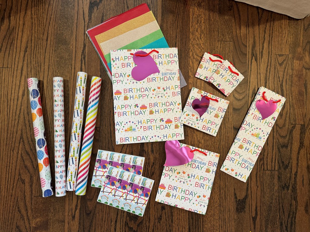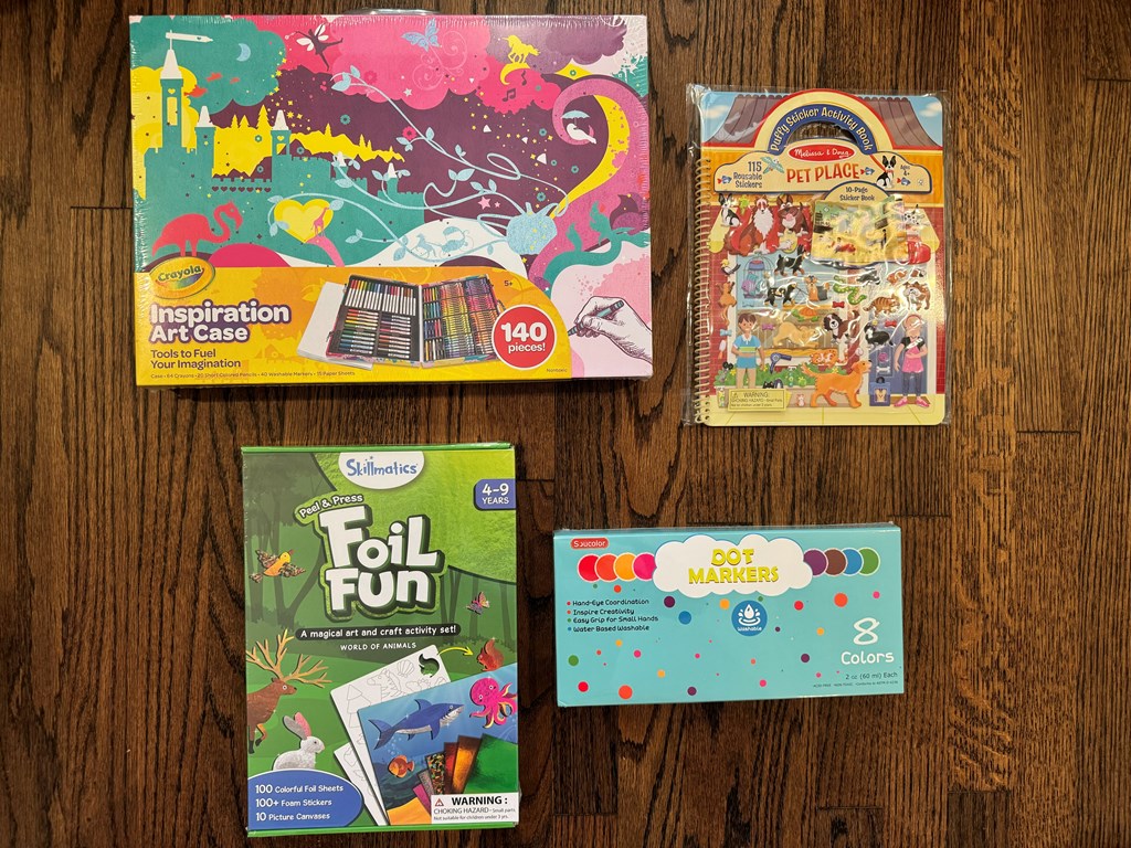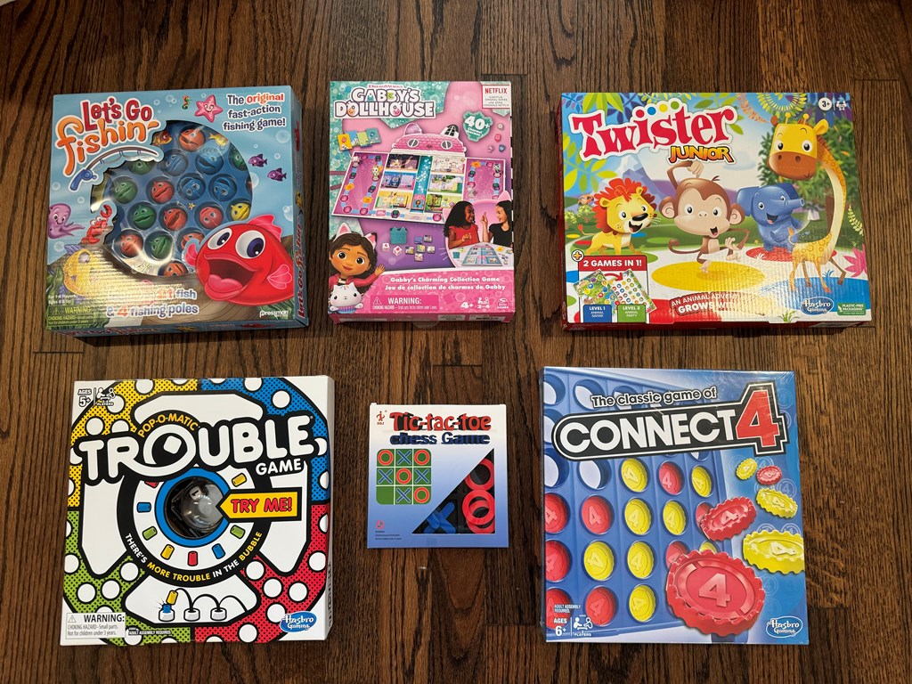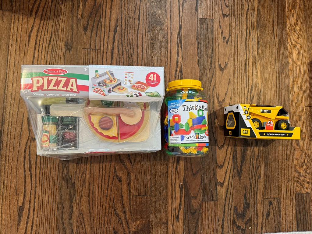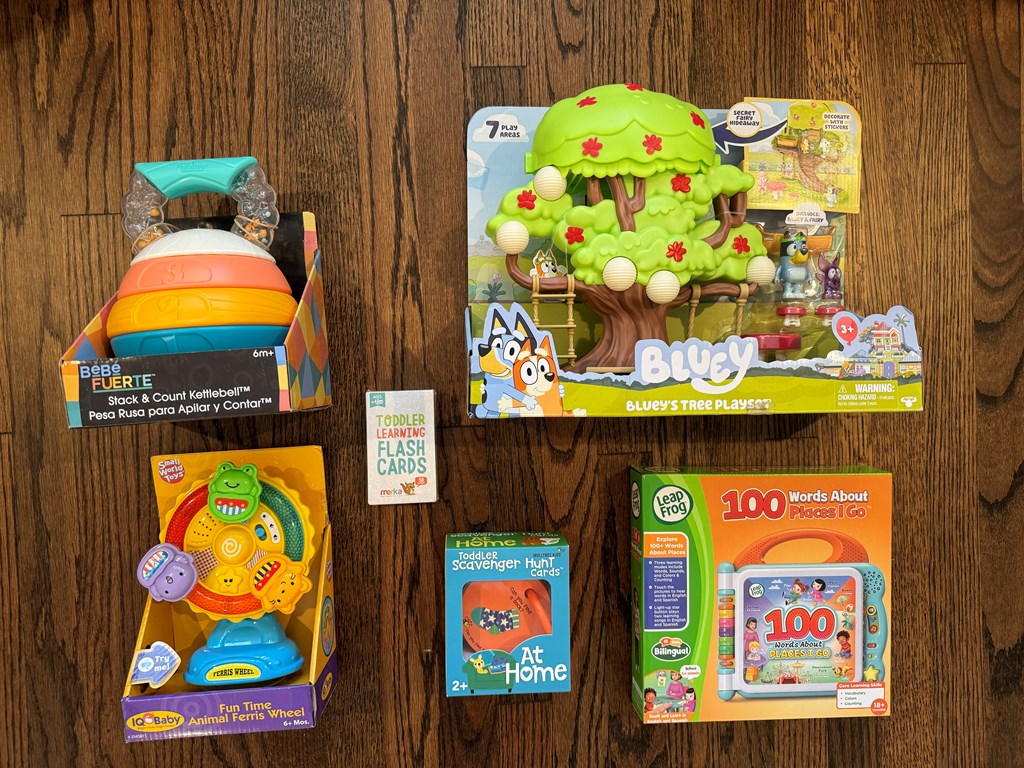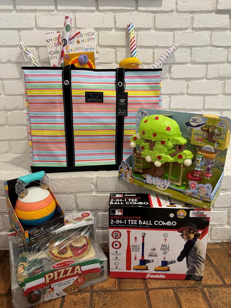 Value: $510 Save time & money! For those always scrambling to get your last minute gifts for your Children's friends' birthdays, this is the basket for you. It includes over 20 children's gifts, gift wrap & bags! Specific items listed below. Items included in the basket are: -Trouble -Connect 4 -Tic tac toe -Let's go fishing game -Gabby dollhouse board game Scavenger hunt game -Dot markers and book -Twister junior -Bluey's Tree Playset -Melissa and Doug - Top and Bake Pizza Counter Franklin 2-in-1 T-Ball -Starter Combo -Monster Jam Big Air Challenge -CAT Power Mini Crew Truck -Leap Frog 100 Words About Places I Go Interactive Book -Merka Toddler Learning Flash Cards -Solar System Jumbo Floor Puzzle - 48 Pieces -Crayola Inspiration Art Case -Melissa and Doug - Underwater Ocean Floor Puzzle - 48 Pieces Melissa and Doug - Pet Place - Puffy Sticker Activity Book -Skillmatics Peel and Press Foil Fun - A Magical Art and Craft Activity Set IQ -Baby Fun Time Ferris wheel -Bebe Fuerte stack & count kettlebell -Thistle Blocks toy -Wrapping Paper 4 Rolls 17" x 120" + gift stickers -Birthday Bags - Colorful Birthday Gift Bag 4 Pack Happy Birthday Gift Bags For Birthday Party With 8 Colorful Tissue Papers and Two mini bags, two wallet (8 Pcs total) -Scout 4 Boys Extra Large Tote Bag for Woman - Utility Tote with Zipper Closure and Handles