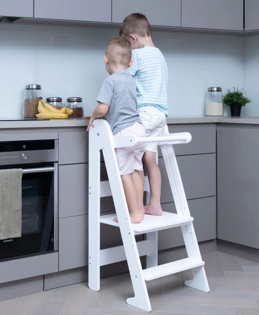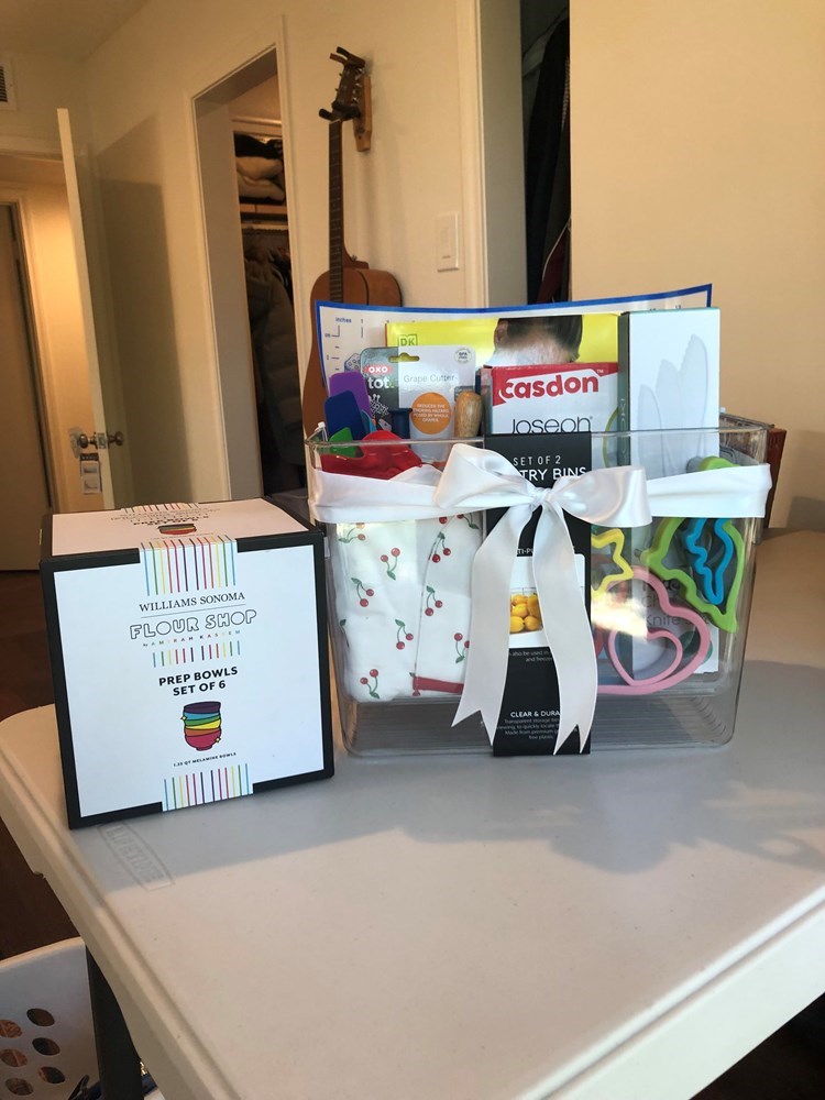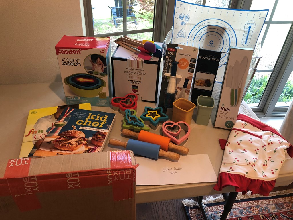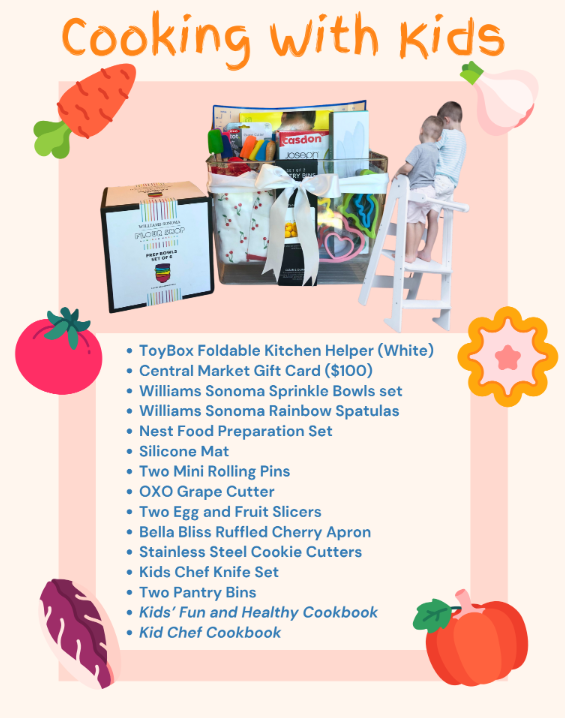 Value: $438 Toy Box Foldable Kitchen Helper (White) $100 Central Market Gift Card Williams Sonoma Sprinkle Bowls & Spatulas Nest Food Preparation Set & Measuring Cups Silicone Mat Two Mini Rolling Pins OXO Grape Cutter Two Egg & Fruit Slicers Bella Bliss Ruffled Cherry Apron Stainless Steel Cookie Cutters Kids Chef Knife Set Two Pantry Bins Kids' Fun and Healthy Cookbook Kid Chef Cookbook