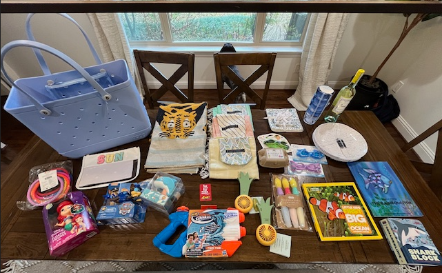 Value: $450 XL Bogg Bag $50 Andy's Frozen Custard Gift Card Anthropologie Tiger Towel 3 Bay Laurel Towels Diving Rings Ariel Pool Toy Chase Pool Toy Water Squirter ""Sun"" Clear Pouch 2 Handheld Fans Egg Sidewalk Chalk Sidewalk Chalk Paintbrush Froggles Swim Goggles 2 Swim Goggles 3 Ocean Family Books Outdoor Plates, Cups, & Napkins Cupcake Wine