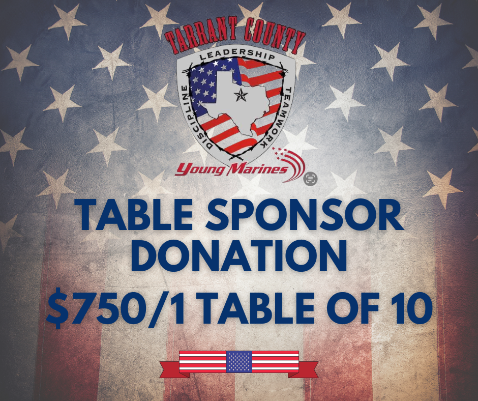 Table Sponsorship - 1 table of 10: $750 Reserve a Table for 10 at the Tarrant County Young Marines Annual Gala & Fundraiser on February 1, 2025, at the Eagle Mountain Church Dining Hall in Newark, TX. Your sponsorship includes: Seating for 10 guests for an evening of dinner, a silent auction, and a raffle. Recognition as a valued supporter of the Tarrant County Young Marines. The opportunity to meet and celebrate Young Marines and local heroes who inspire our community. 🎯 Your Impact - By sponsoring a table, you’ll help us reach our goal of raising $50,000 to send 20 Young Marines on a life-changing trip to Pearl Harbor and historic sites in Oahu, Hawaii, in December 2025. 💪 Why It Matters - The Tarrant County Young Marines is a volunteer-run organization teaching leadership, discipline, teamwork, and good citizenship while promoting a drug-free lifestyle. Your support empowers youth and helps us honor veterans through service and education. Be a part of this unforgettable evening and make a difference in the lives of tomorrow’s leaders. Thank you for your support! Stay updated and connected—please follow us on Facebook: https://bit.ly/TCYM_FB