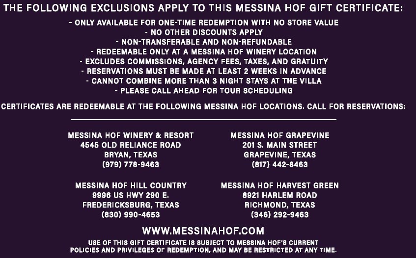🍷 Exclusive Wine Tasting for Six at Messina Hof! ✨ Sip, Savor & Enjoy a Premium Wine Experience! ✨ Indulge in a standard wine tasting for up to 6 people at any Messina Hof location. Gather your friends or family for a memorable tasting experience at one of Texas' most renowned wineries! 🏡 Redeem at Any Messina Hof Location: 📍 Bryan, TX | 📍 Grapevine, TX | 📍 Fredericksburg, TX | 📍 Richmond, TX 🔹 Must call for availability 🔹 Certificate required for redemption 🔹 One-time use—no credit for fewer than 6 guests 🎟️ Bid now for an unforgettable wine-tasting experience! 🍇🍷 Thank you for your support! Stay updated and connected—please follow us on Facebook: https://bit.ly/TCYM_FB