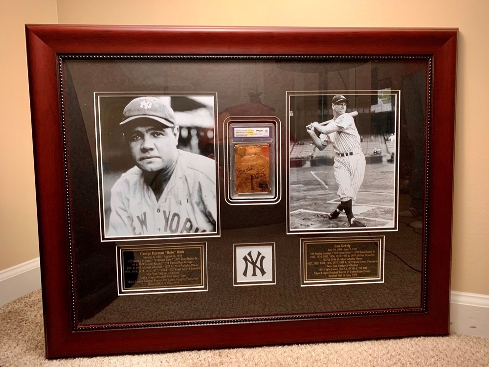 Two New York Yankee Legends are honored here in this wall memorabilia with a 1997 70th Anniversary 23kt gold 10 GEM mint card of Babe Ruth and Lou Gehrig together. This would be an unbelievable one-of-a-kind gift for any baseball fan! Dimensions: Pic and Matte - 26''x19'' Frame - 30''x23''